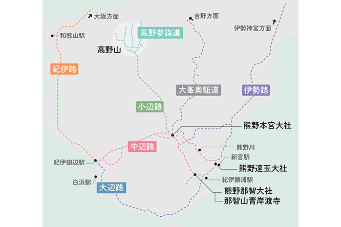包含五條主要路線,分別是紀伊路、伊勢路、小邊路、中邊路和大邊路。其中,中邊路以其古道的原貌最為著名,亦稱為皇族之道,保留了較完整的古道原貌。現代的參拜者依然可以透過這條路探索內心境界,感受沿途的美景、並有機會與當地居民或來自世界各地的登山客交流。