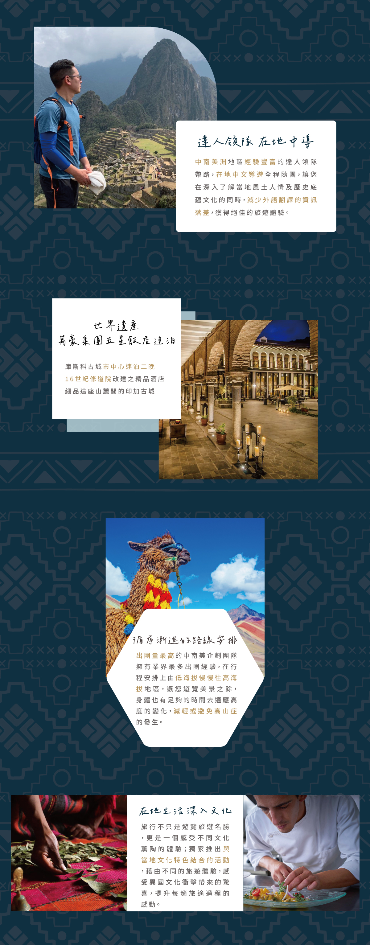 在印加語中馬丘比丘為”古老山頭”之意,其聖潔、神秘且虔誠的氛圍,廣受世人讚嘆,並於1983年被聯合國教科文組織列入自然及文化雙重遺產,更於 2007 年位列全球七大奇觀。