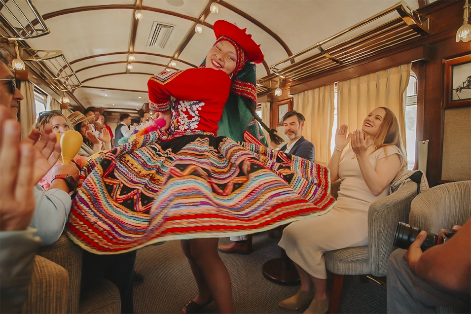 的的喀喀號火車獨特的文化體驗源自現場安第斯傳統舞蹈秀與樂團現場演奏,使用傳統樂器如查蘭戈琴,重現印加後裔的節慶氛圍。表演穿插歷史解說,連結車窗外高原村落景觀,深化文化連結。三道式餐飲融入在地食材如玉米與羊駝肉,搭配侍者復古制服服務,營造1920年代社交貴族感,轉化10小時旅程為文化盛宴。