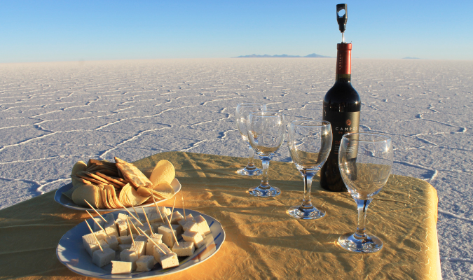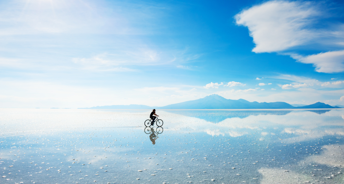 位於玻利維亞境內,海拔近3,700公尺的烏尤尼如同沙漠中的天堂,滿地純白的鹽漠加上雨後沉積的些許雨水,逐漸形成世界上面積最大的鹽湖,約為1/3的台灣大小;在艷陽的照射下,一片白雲藍天讓人看不到邊界,每年12到3月,是當地的雨季,水面反射猶如一大片上帝的鏡子,也成為世人眼裡最荒蕪、最遙遠,卻最純淨的人間淨土,這一望無際的白色世界年年吸引全球的旅人造訪,因此也被認定成為「人生必遊」的旅行目的地之一。