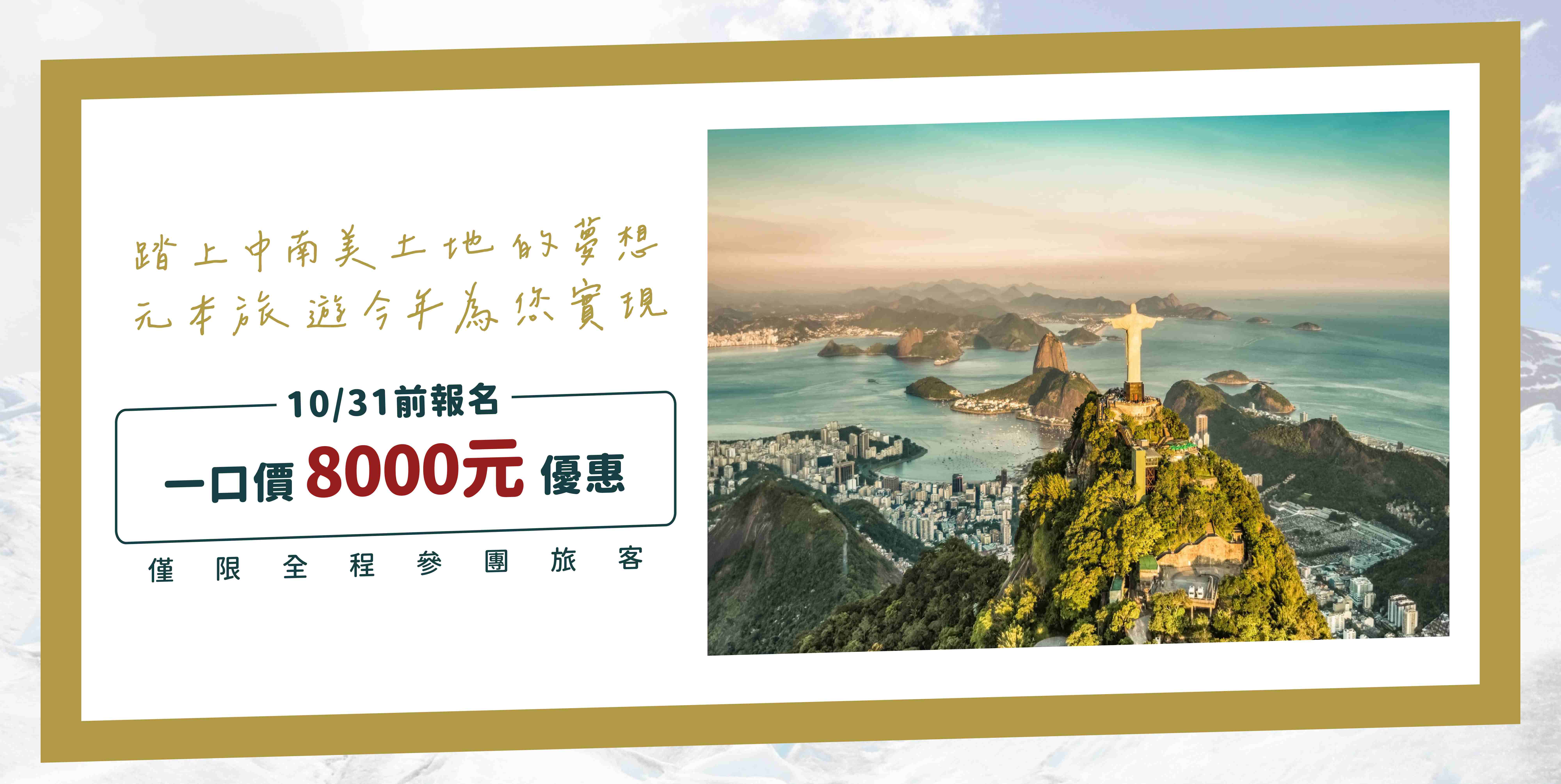 3. 外站參團 (join)、機票自理,可扣除團$80,000元起。團費不含台北-里約熱內盧/聖保羅來回機票、優惠、巴西簽證、特別加贈之旅平險、不便險。