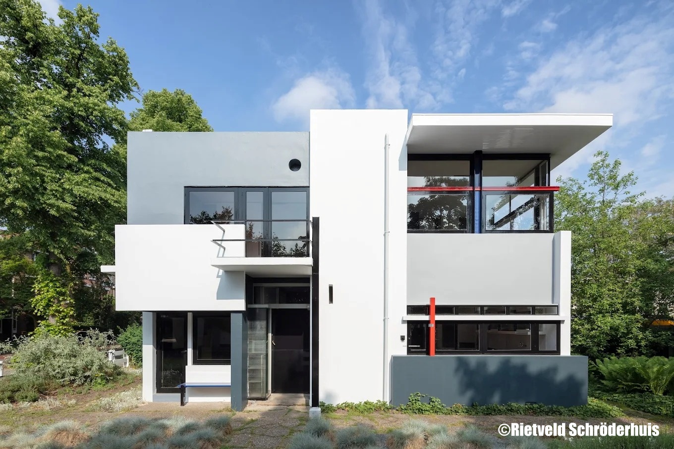 里特費爾德.施羅德住宅是由建築師里特費爾德與屋主施羅德夫人於 1924 年共同設計,是「De Stijl(風格派)」運動的經典代表作與唯一實現於建築中的範例。外觀以白、灰、黑為基底,輔以紅、黃、藍三原色點綴,強調幾何與平面構成之間的動態關係。建築最大的特色在於其靈活可變的空間設計:二樓使用可移動的滑動牆板,可依需求打開或分隔,讓住宅在開放與私密之間自由轉換。這種突破傳統住宅格局的理念,展現了「空間即流動」的現代主義精神。里特費爾德為住宅設計了整體家具與內裝,使建築與生活融為一體。屋主施羅德夫人於此居住超過六十年,直到 1985 年去世。2000 年,該建築被列入 UNESCO 世界文化遺產,象徵現代建築史上由藝術走向功能與自由的轉捩點。如今由烏特勒支中央博物館管理,採預約導覽制,是建築愛好者朝聖荷蘭現代主義的重要地標。