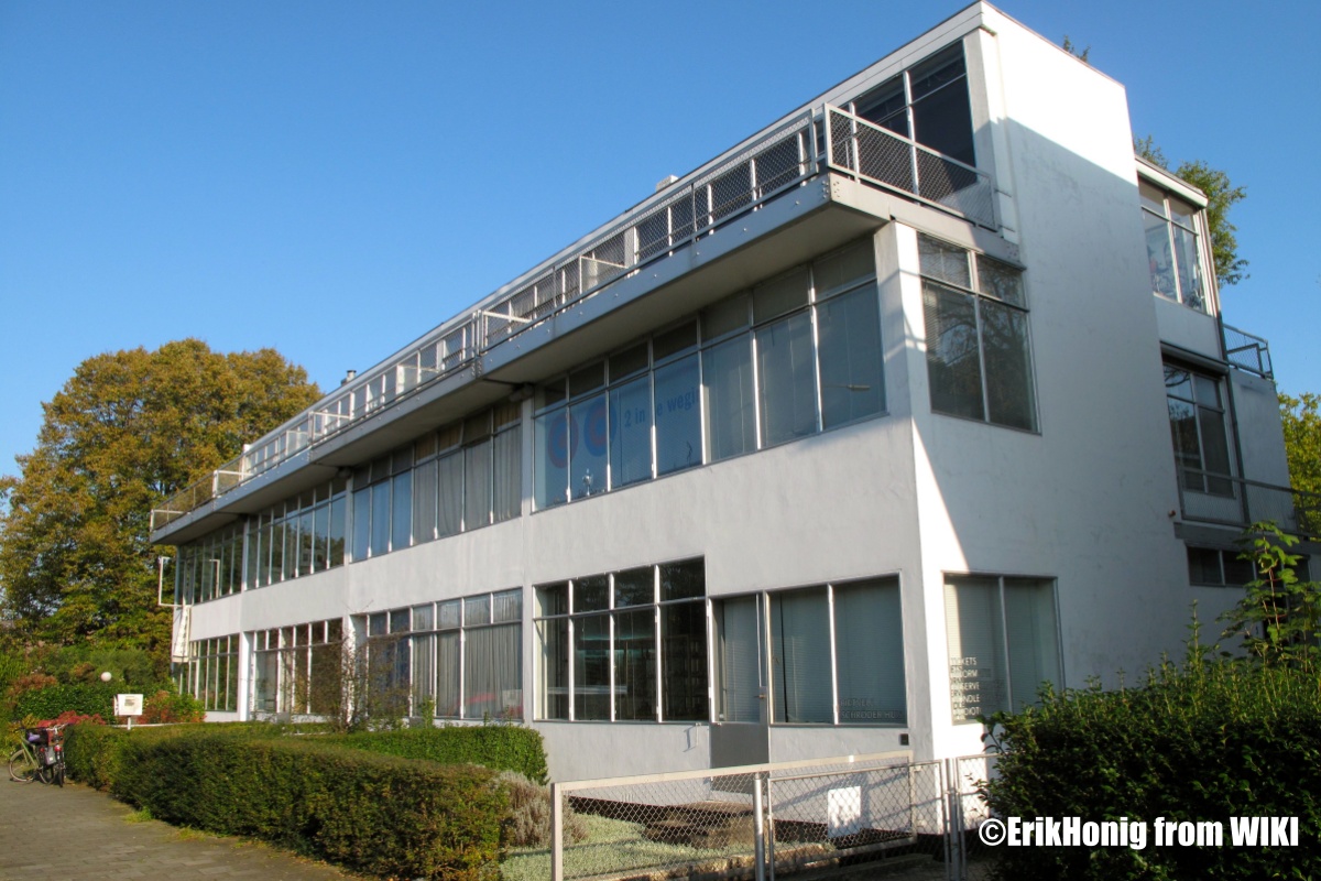◆Erasmuslaan 住宅群:Erasmuslaan住宅群臨近施羅德住宅,是里特費爾德從風格派邁向功能主義的重要轉折作品。住宅群由兩組建築構成,皆為兩層連排鋼骨與磚牆結構住宅。這些房屋外觀潔白、線條簡潔,配以長形水平窗與平屋頂,展現「Nieuwe Bouwen」— 荷蘭現代建築運動的理性精神。里特費爾德延續了他在施洛德住宅中的空間概念,透過靈活的隔間設計與極簡家具,創造出可調節的居住空間。