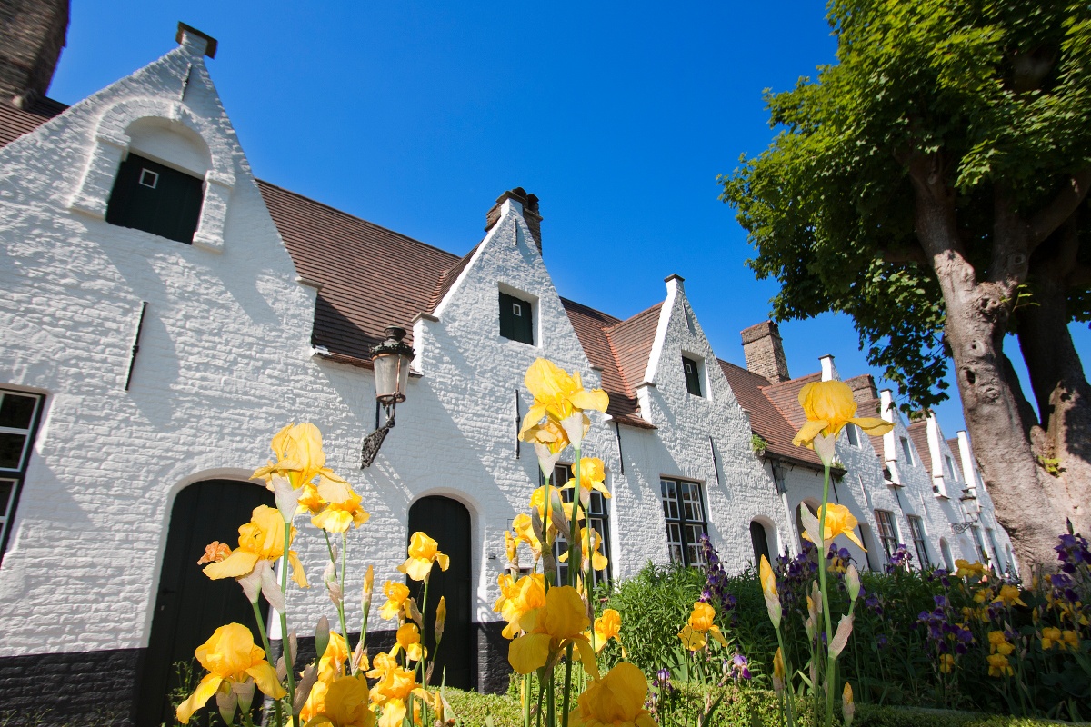 ◆布魯日貝居安會院:布魯日的貝居安會院建於1245年,由佛蘭德斯的瑪格麗特所創立,是中世紀女性宗教社群的典型代表,已被列為聯合國教科文組織世界遺產。當時的「貝居安」是選擇奉獻信仰但不受修道院嚴格戒律約束的婦女,她們在此過著清貧、獨立且服務社會的生活,多從事醫護與教育等工作。會院由約三十棟粉白房屋環繞而成,建築多為16至18世紀風格,圍繞中央庭園與古樹,形成寧靜封閉的方形聚落。入口處跨越小河的貝居安橋通往會院大門,橋上刻有「ANNO 1776」字樣象徵其悠久歷史。院內的聖伊莉莎白教堂融合哥德式與巴洛克風格,內部簡樸而莊嚴。如今仍有本篤會修女與追求靜修的婦女居住於此,延續著貝居安的精神。