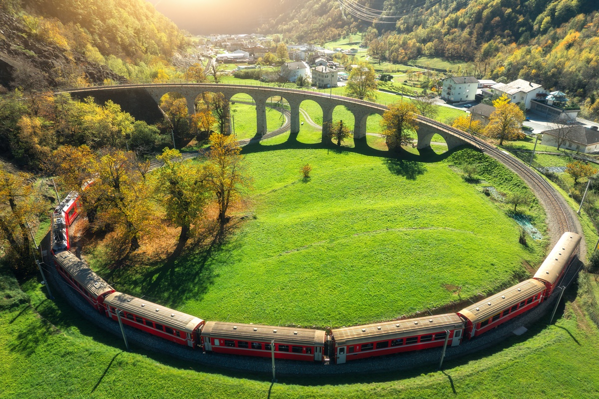 午後搭乘★伯連納景觀列車前往冬季滑雪小鎮聖莫里茲。伯連納列車瑞士最受歡迎的高山鐵道之一,被聯合國教科文組織列為世界遺產。鐵路穿越阿爾卑斯山脈,連接義大利的燦爛陽光與瑞士的高山與冰原。而鐵道線的建造工程上使用了無齒軌技術、螺旋隧道與高架橋(如:蘭德瓦薩高架橋與布里西歐螺旋高架橋)等技術,克服陡峭的地勢,使得列車能夠穩定行駛在起伏的地形上,堪稱是當代工程學的重大突破。