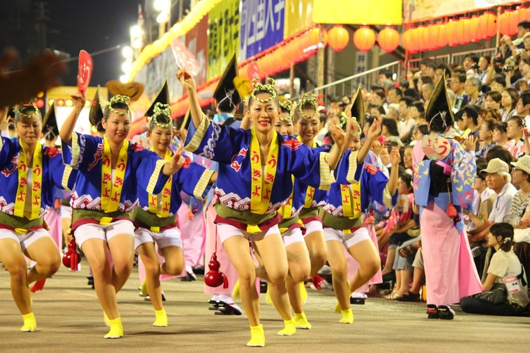 【德島阿波舞祭】阿波舞是起源於日本德島縣(令制國時代為阿波國)的一種盆舞,以三味線、太鼓、鉦鼓、篠笛以二拍子節奏伴奏,搭配舞蹈者的聲音及手部動作的集體舞蹈。並沒有特別固定的模式,相當隨興。全日本最知名的阿波舞活動是每年8月12日至15日期間,在德島市舉辦的「德島阿波舞」,每次約有10萬名舞者表演舞蹈,並吸引約130萬名海內外觀光客參與。