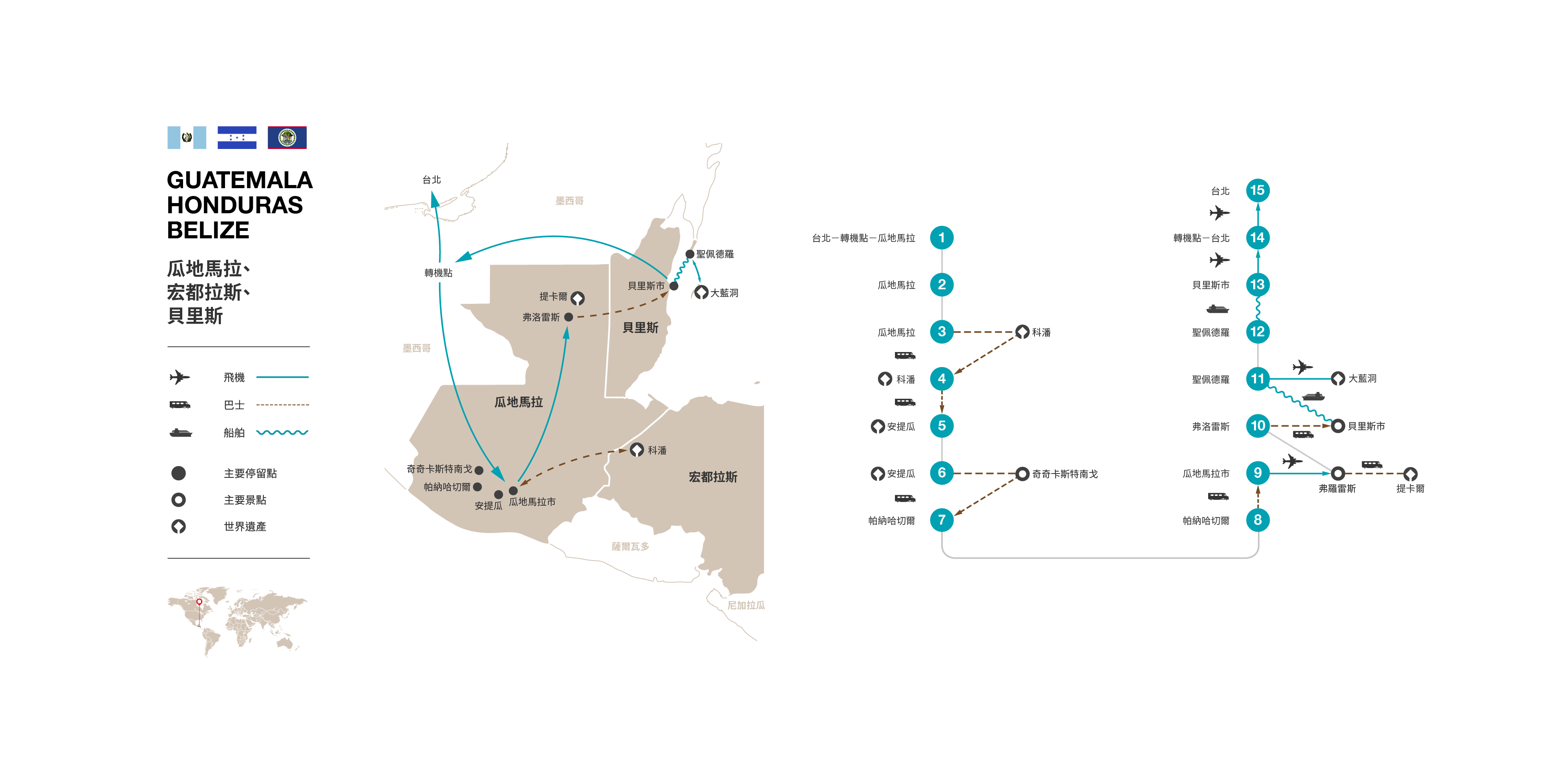 1.此團進入瓜地馬拉、宏都拉斯、貝里斯持台灣護照之旅客免觀光簽證。