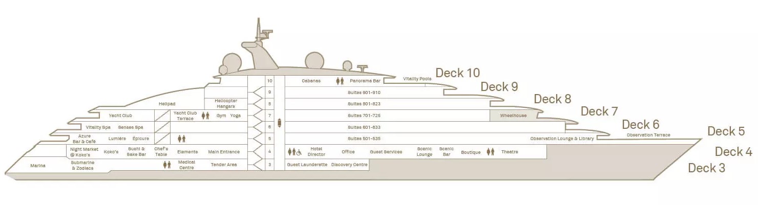 9 Elevator|15 Lumière|16 Azure Bar & Café|17 Scenic Épicure|18 Observation Lounge & Library|19 Observation Terrace|30 Marina Entrances