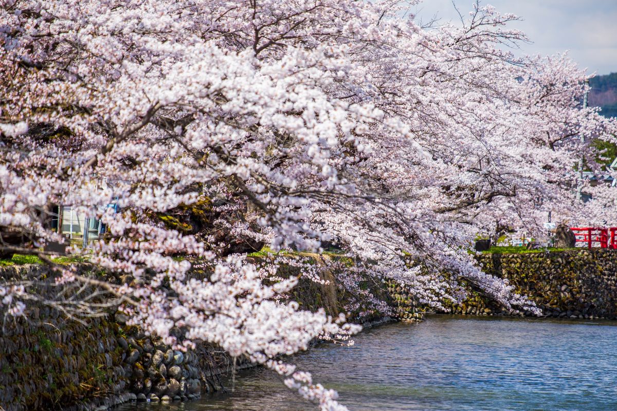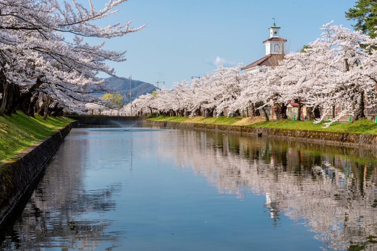 米澤城公園裡留有大量的城廓遺迹。在護城河周圍種植著約200棵染井吉野櫻花樹,編織出一幅美麗如畫的景觀。櫻花姿態優雅,花枝招展覆在護城河上,您還可以觀賞到水面上粉紅色的櫻花和朱紅色的橋樑相映成趣的景觀。