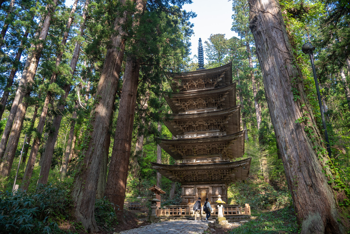與月山、湯殿山並稱為「出羽三山」,為山岳信仰勝地。據稱羽黑山護佑當世幸福,月山、湯殿山則分別護佑前世及來世幸福,因此前往出羽三山的旅程別名「重生之旅」。走過朱紅色「神橋」,就能看到號稱樹齡1000年的「爺杉(jijisugi)」及佇立在巨大杉樹群中的「五重塔」。非常推薦您在這裡跟獲指定為特別天然紀念物的巨大杉樹及國寶五重塔一起拍照留念。夏季還會打燈,景色如夢似幻。