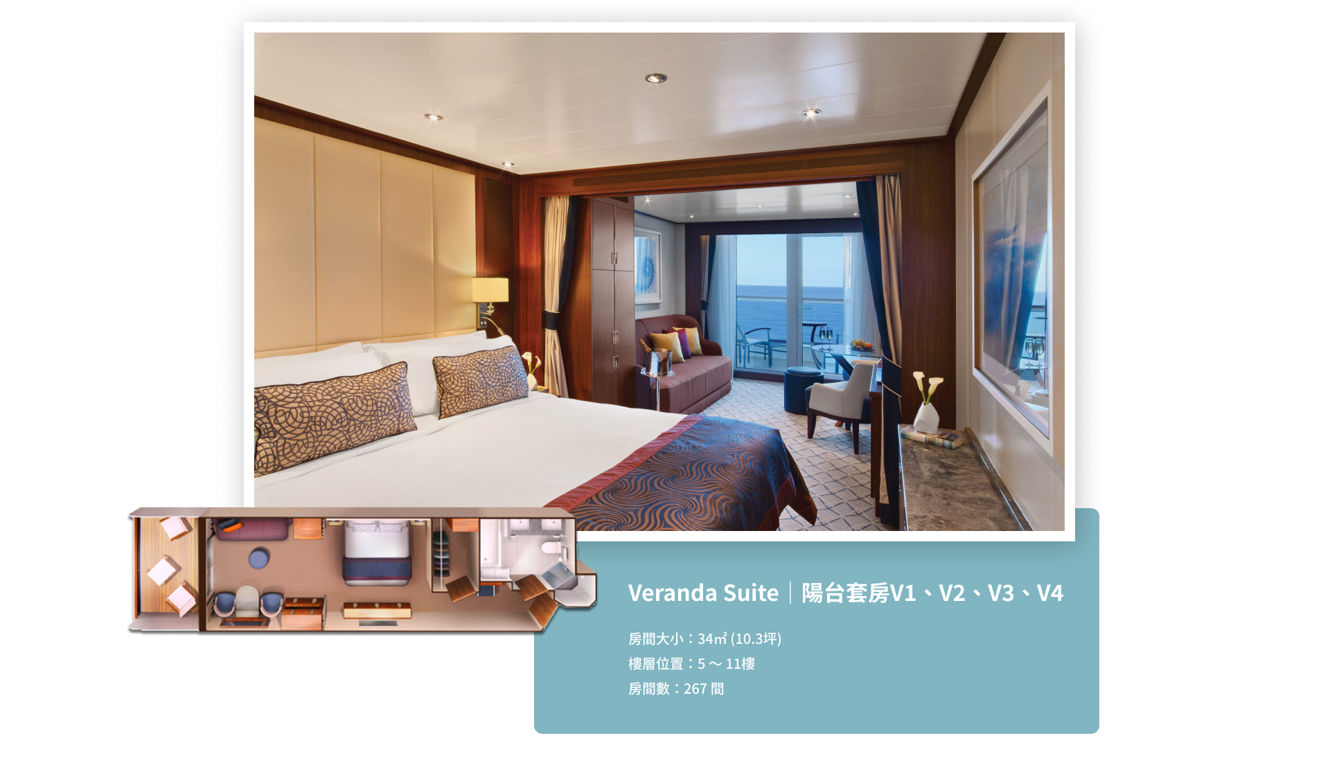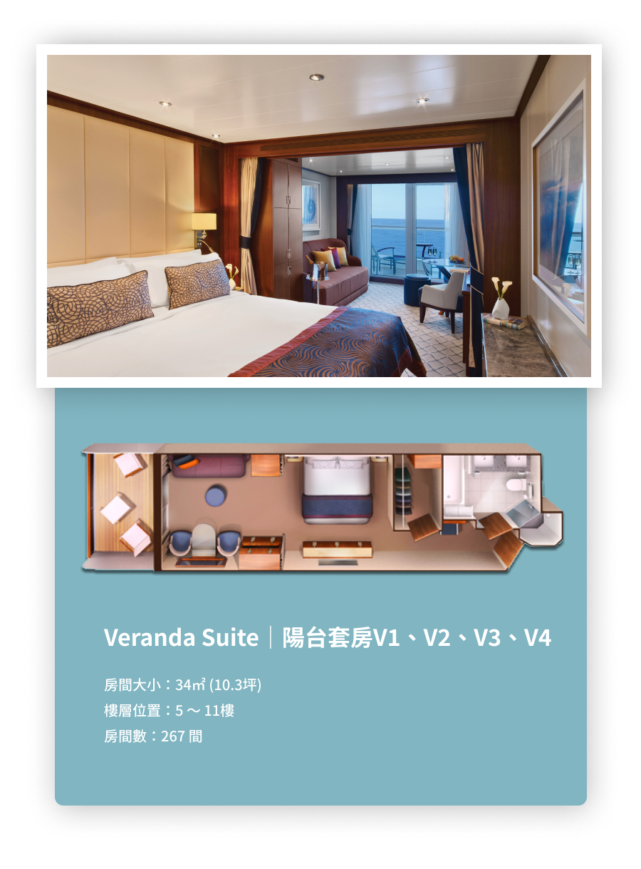 陽台套房介紹 沉穩大器的艙房設計, 打造出優雅別緻的空間, 讓旅程溫暖舒適,比家更有家的感覺