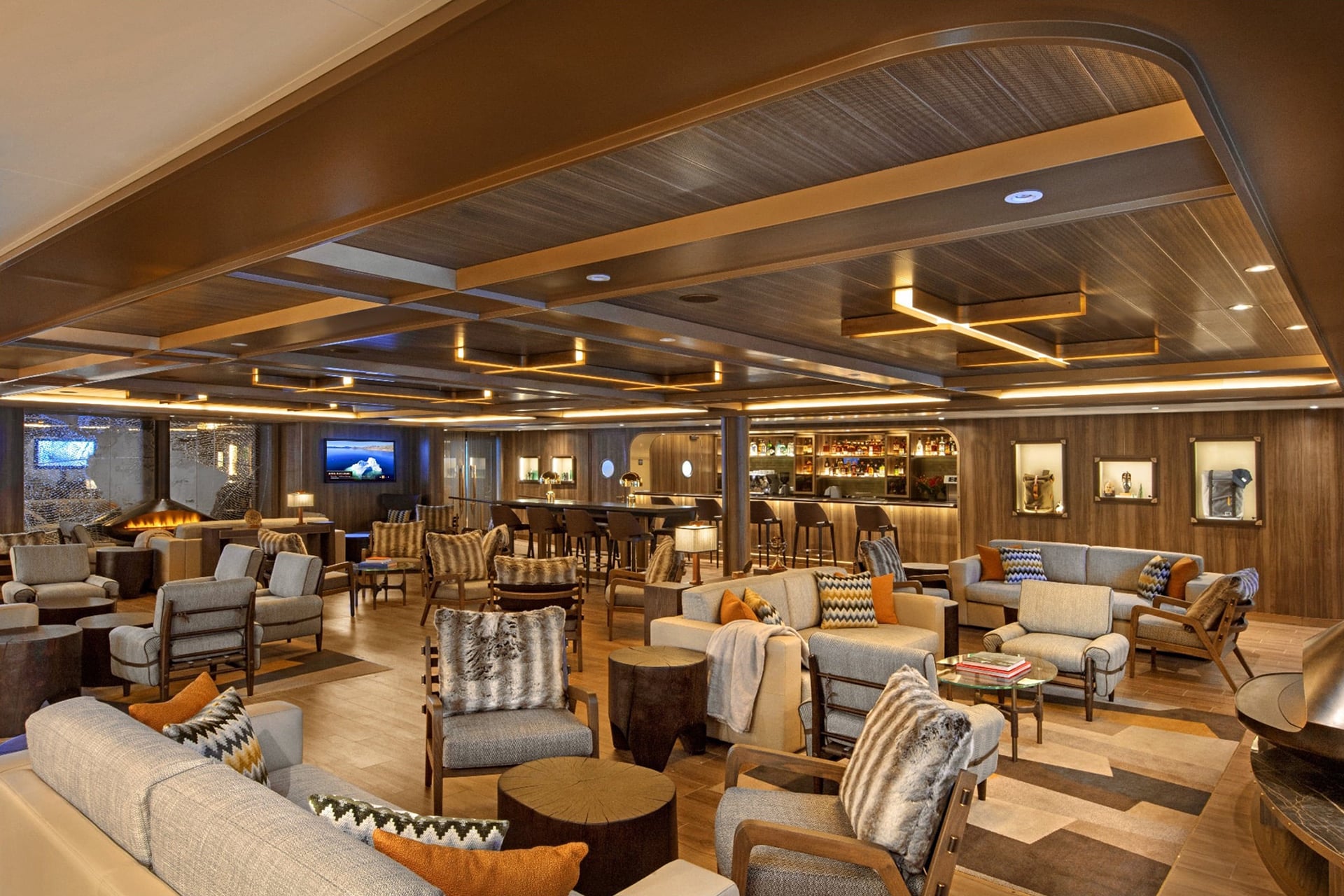 可同時容納所有客人,世界一流的探險隊隊員們 會透過九公尺寬的高清大螢幕,舉辦與當地相關的互動式主題講座, 可以讓乘客更深入了解旅途中遇到的每個景點