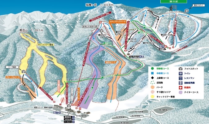 雪場設施:資訊櫃台,售票櫃台,更衣間,免費置物櫃,付費置物櫃,雪板調整台,租供處,商店,免費Lounge,餐廳,咖啡廳,食物販售區,滑雪學校。