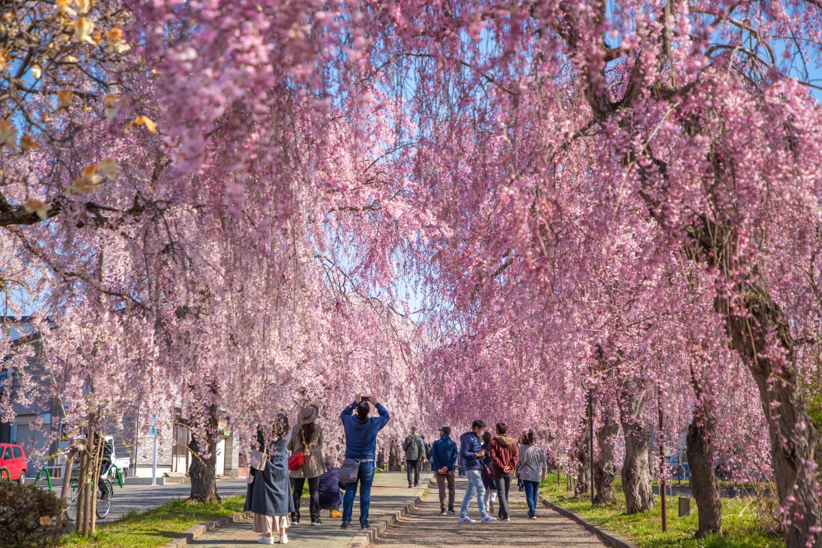 喜多方日中線原本是一條連接喜多方站和熱鹽站的舊鐵道,現在有一部分的路段被改建成單車道及人行道。在長達 3 公里的範圍內,約有 1,000 棵垂枝櫻花盛開。中途附近有展示蒸汽機車,與垂枝櫻花的配合以及櫻花隧道都是絕佳的拍照景點。您可以欣賞福島縣其他地方所沒有的大規模櫻花樹。