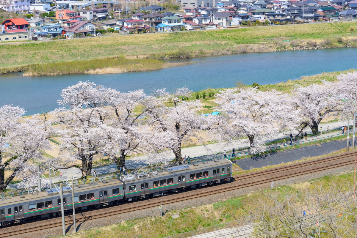在每年4月上旬至中旬櫻花綻放期間,JR東北本線電車行駛到大河原站~船岡站之間時將會放慢行駛速度,因此還能在電車內透過車窗賞花。特別安排搭乘這一段電車,緩緩行經白石川,讓您從電車上觀賞櫻花滿喫的優美畫面。